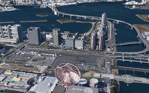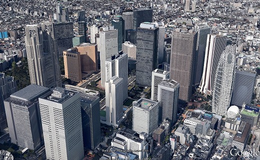 パソコンで見るならば「F11」キーでフルスクリーンモードにされるようお勧めします。普通に使われているブラウザの小ぶりな窓では、上に引用した絵よりぼけた感じになります。移動するにはマウスで動かすより、矢印キーが楽しいと思います。絵を大きくして、即ち高度を下げてヘリで飛び続ける感覚が味わえます。地形の起伏や田畑や森の表現もなかなかです。5年ほど前には「ちず丸ぐぃ〜ん」が建物の輪郭を連続合成してこれに近い感じを味あわせてくれましたが、新しいグーグル3Dの精細感は抜群に優れています。説明ページは「新しく美しい 3D マップで東京の空を飛んでみよう」にあります。