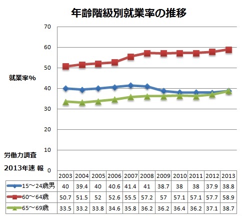 中国政府が1月に大気汚染時の強力な緊急措置を発表しました。しかし、今日経新聞朝刊トップ《高齢者が働く人の1割に 636万人、世界に先行》が気になって、元になっている労働力調査速報を見直しました。年齢別就業率の推移から、やはり若者の職を奪っていると言わざるを得ません。「日本が高齢者雇用で世界に先行していることを裏づけた」と前向きにうたっていますが、高齢者の視点ばかりでは困ります。若者層への影響には65歳以上の高齢者以外に、60〜64歳の層が過去10年で8.2ポイントも就業率を上げた点も見逃せません。最も割を食っている15〜24歳の男性と並べてグラフにしたのでご覧ください。