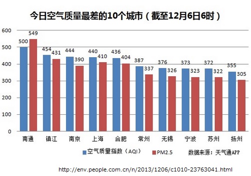 人民日報には毎日のように各都市の汚染ランクがグラフで掲示されるようになりました。上には東部各都市がスモッグに覆われた12月のグラフを引用しました。微粒子PM2.5が大気1立方メートル当たり35マイクログラムが日本の環境基準ですが、上海・南京など軒並み10倍前後に達していました。