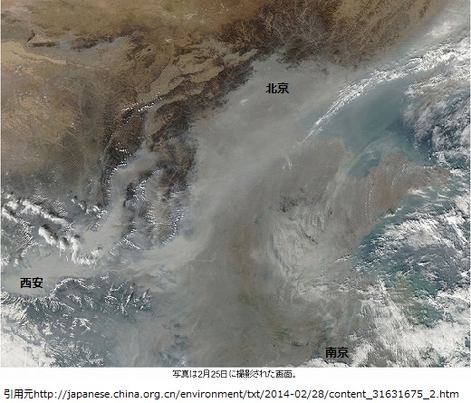 2月下旬、丸6日も北京など中国主要都市を覆った重篤スモッグの衛星写真が中国網日本語版に掲載されたので、引用して紹介します。それぞれ9百キロずつ離れた北京・南京・西安3都市間を丸呑みにした巨大さが分かります。25日NASAによる撮影で、上空の雲は白く見えており、ねずみ色がスモッグです。
