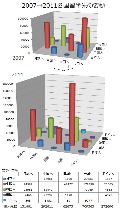 2009年の第190回「留学による大移動は新段階、中韓米日で見る」で整備しておいた2007年の中韓米日4カ国データを基盤にして、2011年の状況を見るグラフ「2007→2011各国留学先の変動」を作りました。人数はその年の新たな留学者数です。2011年は欧州代表のドイツを加えて5カ国にしました。OECD統計「Education at a Glance 2013」に加えて、OECDから漏れている中国の留学生受け入れ統計を合わせています。