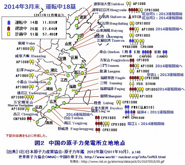 福島原発事故で一時足踏みしていた中国の原発建設が一気に進み始めました。今年2基目が運転を開始、年内に続々と運開です。中国での運転が世界初の2機種を始め主流国産型も新型炉で他人事と思えぬ危うさ満帆です。日本の原発ならフルパワーで長期継続運転が当たり前ですが、電力事情が悪く停電が発生しがちな中国では、無計画停電すなわち外部電源喪失のたびに原子炉の緊急停止、非常用発電機を含む炉心冷却用電源の確保、再立ち上げと煩雑な操作を繰り返さなくてはなりません。安定稼働実績が無い新型炉でこれを頻繁にするのは実地テストにはなるものの対応する運転員も含めて過酷です。3月末時点での原発建設と運転開始の動きをまとめたマップをご覧ください。