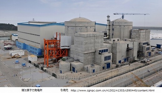 2011年末現在、14基稼働の地図に26日運開の広東省・陽江原発で18基になるまでを書き加えました。福島原発事故の後では2013年2月、遼寧省の紅沿河原発が最初の運開、次いで福建省の寧徳原発、2014年に入って紅沿河2号、そして陽江1号です。以上の4基は「CPR1000」と呼ぶ仏アレバ社の加圧水型原発を国産化した百万キロワット炉です。最初に造られた嶺澳3号(広東省)から数えて4年に足りぬ稼働実績しか無いまだ新しい機種です。陽江原発の写真を引用します。