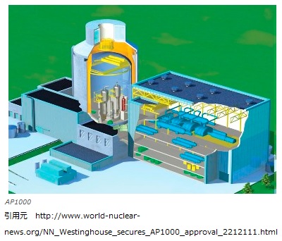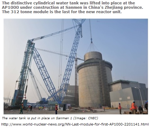 CPR1000は年内さらに福建省の福清原発が運開予定です。そしてこの後、浙江省の三門原発と山東省の海陽原発で、世界でまだここだけの第3世代加圧水型炉「AP1000」が運転されることになっています。115万キロワットの大型炉です。東芝グループのウェスチングハウス・エレクトリック社がこれまでの経験を注ぎ込んで、運転員の操作や電源がなくても安全システムが働くように設計したといいます。三門1号と内部構造の写真を並べて引用しておきます。特徴的な点は格納容器の上に巨大円筒の水タンクが載っかっていて、上から水を注入できます。でも普通の運転員は最後の手段に頼らずに事態を収拾しようとするものです。