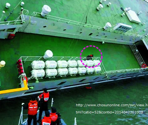 《海洋警察が22日に公開した写真を見ると、救助隊員1人(点線内)がセウォル号に乗り込み、手すりに沿って取り付けられた救命ボートの方に移動する様子が見える。隊員は10メートルほど離れた後ろ側の救命ボートから取り出そうとしたが、全く動かなかった。隊員が10個目の救命ボートに手を触れていたとき、「立ち入り禁止」と書かれた操舵(そうだ)室左側の出入り口から、乗務員とみられる男性が飛び出してきた》