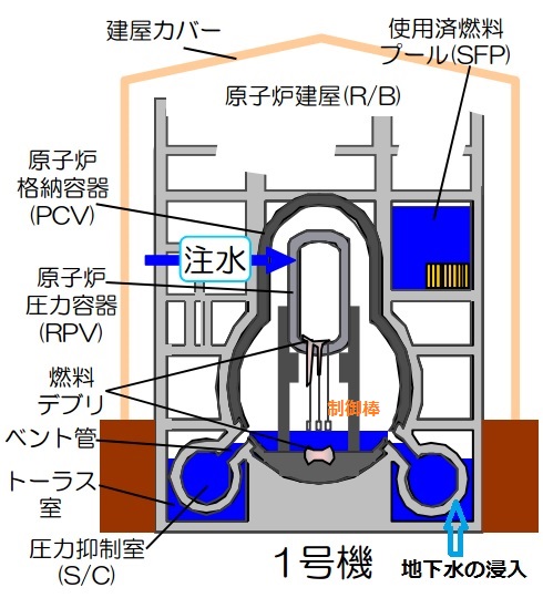 東電が4月に公表した「中長期ロードマップ進捗状況(概要版)」から1号機の状況を切り出し、引用しました。スリーマイル島原発は加圧水型でしたから制御棒は炉心上部から挿入でした。福島原発は沸騰水型のため炉心上部が使えず制御棒は圧力容器の底に穴を開けて通していました。炉心溶融が起きるとこの穴が脆くも貫通して溶融燃料(燃料デブリ)が格納容器の底に落ち、図では中央に固まって描かれていますが、どろどろになって広がったと考えられます。
