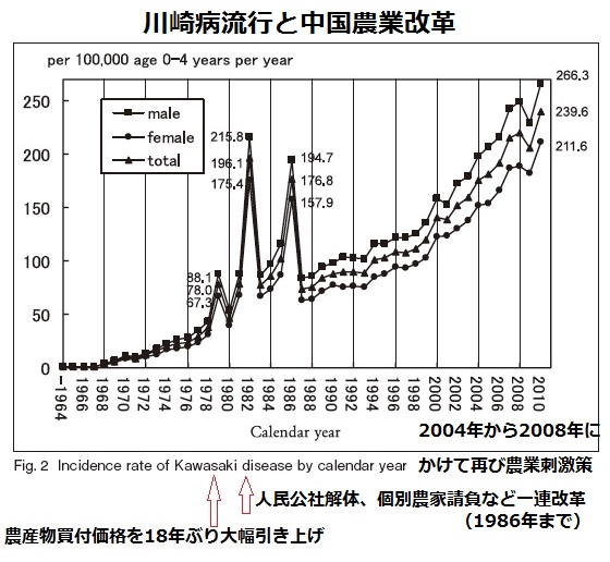 自治医科大学公衆衛生学教室の《川崎病全国調査からみた川崎病疫学の特徴とその変遷》にある罹患率推移グラフには過去3回あった全国規模の流行ピークが現れています。1979年、1982年、1986年で、そのころ中国の農村で何が起きたか調べました。1979年には中国政府が農産物買付価格を18年ぶりに大幅に引き上げました。生産の刺激策を取ったのです。最も大きなピーク1982年の元日には個別農家への請負制を認める中国共産党中央の文書が発表され、集団営農だった人民公社制度が一気に解体に向かいました。3番目のピーク1986年にかけて農産物と副産物の統一買付けと割当買付け制度廃止など生産自由化が次々に打ち出されました。