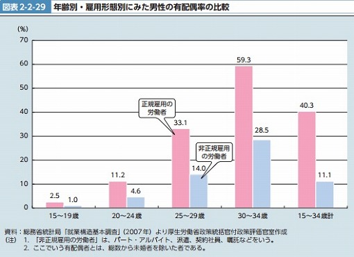 『結婚離れは非正規雇用増の結論避ける厚生労働白書』で取り上げた厚生労働白書のグラフ「年齢別・雇用形態別にみた男性の有配偶率の比較」を掲げました。非正規雇用の男性にはこれだけ歴然とした結婚のしにくさ、あるいは結婚に手が届かない収入の低さ・不安定さがあるのです。
