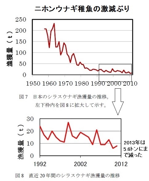 国際自然保護連合がニホンウナギを「近い将来、絶滅する危険性が高い」として絶滅危惧種に指定しました。メディアは食べられなくなる心配とセットで報道しますが、保護に失敗した日本はむしろ歓迎すべきなのです。昨年夏に第371回「食べられぬ心配だけで保護意識が無いウナギ報道」で紹介した稚魚激減グラフを掲げます。積極的な保護策を打ち出せぬまま最盛期の50分の1まで落ち込んでしまい、はっきり言って手遅れ状態です。