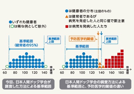 《高久日本医学会長は、通常、検査の「基準値」と言われているものには「基準範囲」と「臨床判断値」があるが、両者は意味するところが全く違っており、明確に区別すべきものであると説明した上で、先般、人間ドック学会・健保連が公表したのは「基準範囲」で、これは、多くの健常人から得られた検査値を集めて、その分布の中央95%を含む数値範囲を統計学的に算出したものであり、疾病の診断、将来の疾病発症の予測、治療の目標などの目的に使用することは難しいとの考えを示した》《「疾病の診断、将来の疾病発症の予測、治療の目標に用いられるべきは臨床判断値である」と強調した》