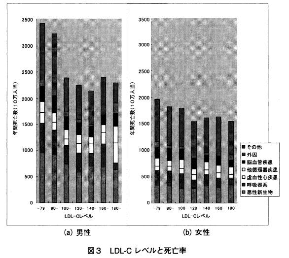 「図3 LDL-Cレベルと死亡率」を引用しました。「神奈川県伊勢原市で1995年度から2005年度まで男性9.949人(平均年齢64.9才)、女性16、172人(平均年齢61.8才)を追跡して、LDL-Cレベルと原因別死亡率を調べた結果」で、平均追跡期間は8年を超します。《「悪玉コレステロール」なのですから増えるほど、つまりグラフの右側ほど死亡率が高くならなければいけません。一目瞭然、話が逆でグラフは右下がりです。コレステロールが問題になるであろう虚血性心疾患などが棒グラフ中央の白っぽい部分です。男性の一番高いグループでやや増えていますが、LDL−Cが低いグループは悪性新生物つまり癌や呼吸器系の疾患が多くて遙かに高い死亡率になっています。LDL−Cが足りないと抵抗力が弱まるからです。一方、女性でいずれのグループもあまり変わらず、「LDL-Cを下げる必要性は全く無い。従って、女性では120mg/dl以上が最適値である」》