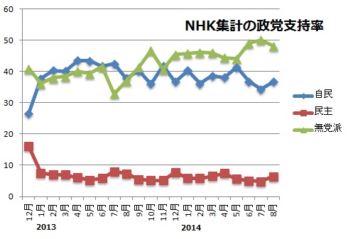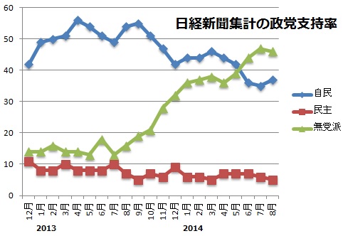 当初は順調だった安倍首相の政権運営で、有権者の批判を呼ぶ節目になったのは昨年10月の消費増税決定、12月の靖国神社参拝、そして今年7月の集団的自衛権の閣議決定でしょう。どちらのグラフでも政党支持率に影響が読み取れます。この間に、自民支持層から多くが地滑り的に純・無党派に移行した状況が日経集計でより鮮明です。NHK集計でも無党派層が5割に達する勢いです。