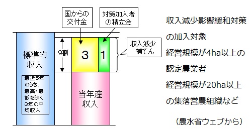 農水省ウェブから引用した収入減少影響緩和対策の仕組み図です。農協の概算金が事実上の米価である実態があっても、いくら下がろうと過去収入との差額を9割まで補填する保険のような仕組みが4ヘクタール以上の専業農家などには出来ています。その過去収入がコメ60キロ1万5000円と算定されており、今年産米に限っては対策に加入していない零細農家にも、今年の収入との差額半分の国費補填を考えるというのです。