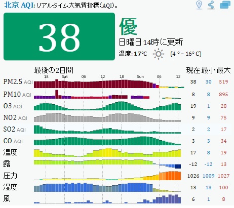 来月7日から北京で開くアジア太平洋経済協力会議首脳会合を前に10月に入って重篤スモッグが頻発しています。海外からの観光客減少も認めざるをえない状況で、ホスト国の威信守れるかは強い北風が吹くかが頼りです。26日午後2時現在、米国大使館の汚染測定グラフを下に掲げます。微粒子PM2.5濃度が日本基準の10倍はある「厳重汚染状態」が続いていたのに、一番下の「風」が吹き出した途端、一気に優良な大気に変わっています。