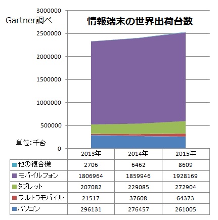 タブレット急増のブレーキは米AppleのiPad出荷台数が前年割れになるからです。スマホのように2年くらいで買い替えるのでなく、3年以上から4年も使い続ける消費者が多いようです。これはパソコンの買い替えサイクルと近いと言えます。買い替えの波は2015年に来るようです。グラフの「モバイルフォン」の半分くらいがスマホで、従来型携帯電話も根強いようです。パソコンは減りながらも意外に堅調であり、スマホの続伸と合わせて2015年には端末出荷が前年比で5%伸びて25億台になると予想されます。