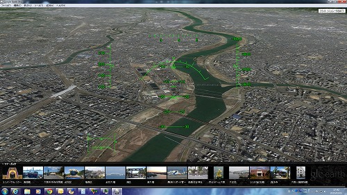 グーグルアースの「ツール」タブにあるフライトシュミレータも使えますが、かなり上空を飛ばないと失速、墜落してしまいます。ヘリのように建物を眺めながら飛ぶには上の写真程度に大きくして、矢印キーで飛行方向を操作するのが善いでしょう。参考にフライトシュミレータでの画面を以下に引用します。大阪の淀川上空を飛んでいるところです。