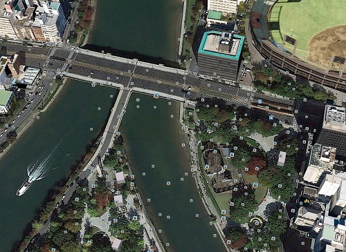 昨年初めに首都圏と宮城県エリアで始まったグーグルアースの3Dマップが全国の地方都市にまで拡大しています。建築物の精巧な3次元化なのでヘリで上空を飛ぶ感じが味わえます。自分の街の空を飛んでみてください。例として広島市の原爆ドーム付近と札幌市の中心部を切り出した写真を掲げます。
