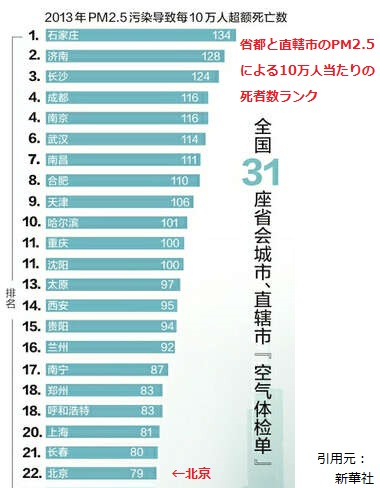 重篤スモッグで世界から注目される北京よりも、地方の省都の方がPM2.5による被害がずっと深刻であると判明しました。北京大の調査で10万人当たりの死者数が百人を超える10市に比べ北京は79人に留まりました。2013年時点で河北省の石家庄134人、山東省の済南128人、湖南省の長沙124人など北京の西や南、さらに内陸部の方が大気汚染はひどいと示しています。新華社が伝えたランク表から22位の北京まで上位部分を以下に引用します。