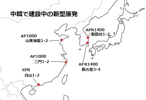 全く新設計の大型原子炉、それも実証炉など造らずいきなり商業炉建設に突き進んでいる新型原発が2016年、中韓で相次いで運転開始になります。原発管理に危うさがある両国だけに隣国民として注視せざるを得ません。いずれも100万キロワットを大きく上回る大型炉です。世界原子力協会のデータベースや報道をまとめると、運開一番手は米ウエスチングハウスによるAP1000型(125万キロワット)が中国・山東海陽サイトで、次いで韓国開発のAPR1400型(140万キロワット)が韓国・新古里サイトで、最後が仏アレバによるEPR型(175万キロワット)が中国・台山サイトでとなりそうです。