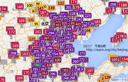 中国の北京を中心にした華北一帯が今月初めに続いて重篤な大気汚染に見舞われています。16日昼から始まって17日中は継続する見込み。国威発揚の軍事パレード向けに無理やり実現した青空は跡形もありません。人民日報は中度汚染の天気予報を出していましたが、北京中心部などで大気質指数が300を超え屋外活動中止の重汚染が広がっていると、以下に掲げる米国大使館サイトの地図から読み取れます。指数が400台に乗っている地点があり、PM2.5濃度が1立方メートル当たり200マイクログラムを超えています。