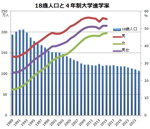 先進国で稀な研究論文数の減少・大学ランクの退潮と科学技術立国が危ぶまれる事態の中、間もなく18歳人口減少で大学淘汰が起きます。政府の失政による若手研究者のポスト不足に、研究職激減の大波が加わります。2018年以降の大学淘汰時代が見えやすいよう、文部科学統計要覧・学校基本調査など公開資料からグラフを作りました。平成に入った1989年から2024年まで35年間の18歳人口の推移と、2015年までの4年制大学進学率の実績です。