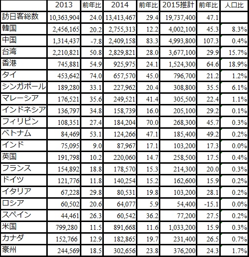 人口比で台湾15.7%と香港18.9%は際立っています。国民のほぼ6人に1人、5人に1人が2015年中に訪日したことになるからです。続く韓国8.3%、シンガポール6.1%も驚くに値する数字です。2014年に日本から中国へは271万人、韓国へは228万人ですから、日本の人口比では2%のレベルです。シンガポール並になれば800万人ですから、もしそれだけ日本から中国を訪れたら国内で「大中国ブーム」と騒がれるはずです。中国の訪日客数も人口の0.4%に達し、1%に迫るに従い質的変化が大きくなるでしょう。