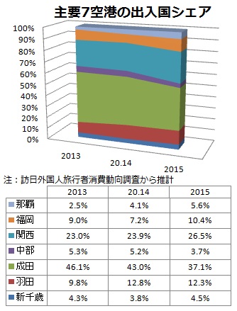 訪日外国人旅行者消費動向調査は調査員による聞き取りで、主要空港利用者シェアを推計できそうです。2013年から2015年まで10−12月期調査から主要7空港間の出入国シェアをグラフにしました。