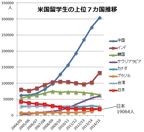 アジア各国に押されまくって日本の米国留学衰退が嘆かれています。質の悪い学生まで送り込む中国に注目が集まりがちですが、人口1万人当りの留学生数で見ると韓国と台湾は極めて特異であり各国の裏事情を探ります。日本の米国留学生は1990年代半ばには5万人に迫り、国別のトップだったのです。90年代末に中国に抜かれ、2000年代初頭にインド、韓国にも追い越されました。さらにカナダ、ブラジル、台湾に抜かれ、2014/15スクールイヤーでは10964人と7位にまで落ちています。