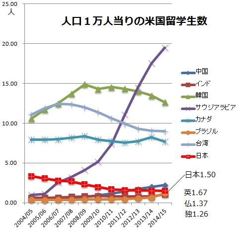 英語が話せて地続きの隣国カナダは特別として、数千万クラスの中規模人口3カ国の特異さが浮かび上がります。中でもサウジアラビアは人口1万人当り20人に迫り、日本の1.5人とは10倍以上の差です。国民500人に1人が米国留学生になった秘密は前の国王名を冠した奨学金制度です。2005年設立で授業料全額に生活費・医療保険、年1回の帰国往復運賃までが支給されてきたのです。しかし、原油収入激減で2016年からは世界で上位100校など高ランクの大学に制限することになりました。原油安が続くなら、今後は大きく減るはずです。