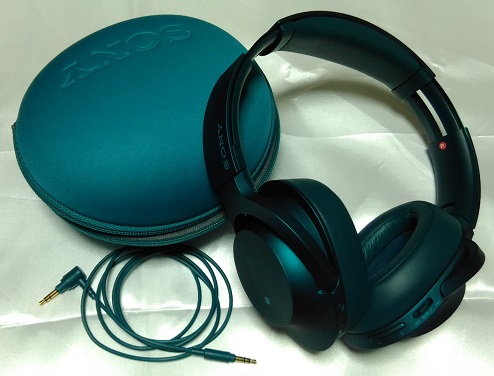 購入したのは5色ある内の青系で、3万円くらいで入手できます。折りたためる構造で幅18センチ、奥行き15センチの携帯ケースが付いてきました。Bluetooth 4.0に対応したワイヤレスで、私の場合はタブレットに蓄えた224kbpsのMP3ファイルを主に聴いています。圧縮音楽ファイルの高音域を回復させる機構が常時ONになっており、結構効いている感じです。写真左下のケーブルでも接続可能です。本体が電池切れの場合にも使いますが、音質は鈍くなります。右側部の下に曲送りやボリュームの操作部が見えます。