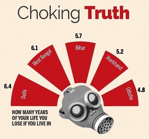 7日付の「Delhi’s pollution takes 6 years from your life, says study」から引用しました。北西部にあるデリーで6.4年、以下の4州は東部で西ベンガルが6.1年、ビハールが5.7年など住民が寿命を縮めるとの表現です。息が詰まる真実だと、ガスマスクの絵をあしらっています。