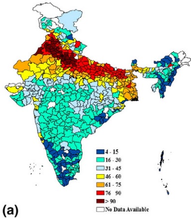 2000年から2010年の期間でPM2.5の年間平均値をマイクログラム/立方メートルで推定、詳細な地図にしています。日本の環境基準値「1年平均値 15μg/m3以下 かつ 1日平均値 35μg/m3以下」に照らして見て下さい。「4-15」である群青色の地域しか大丈夫なところは無く、ほとんどが東端部や南端部に限られます。ガンジス川沿いは特に酷くて、「76-90」の赤や「90以上」の焦げ茶で埋め尽くされています。これではインド旅行をしたい気持ちが薄れてしまうでしょう。