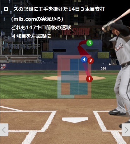イチローが今現在、高度な勝負を続けている現場をローズの記録に王手を掛けた14日パドレス戦8回、この日3本目の安打で見ましょう。「mlb.com」の実況画像から引用しました。ストライクゾーンが描かれているので見やすいです。1死1塁、相手の左腕は内角いっぱい、147キロ前後の速球攻めに徹し、左打者のイチローから見て胸元に真っ直ぐ差し込んでくる感じです。1球目中ほどは見逃しストライク、2球目が高目いっぱいで空振りストライク、3球目に高いボール球を見せておいて4球目は空振りした高さで勝負です。ボール1個真ん中に寄ったのをイチローは鮮やかに左翼線に流すヒットにしてしまいました。左打者は左腕に弱い常識に反して、イチローは左腕の方が高打率です。