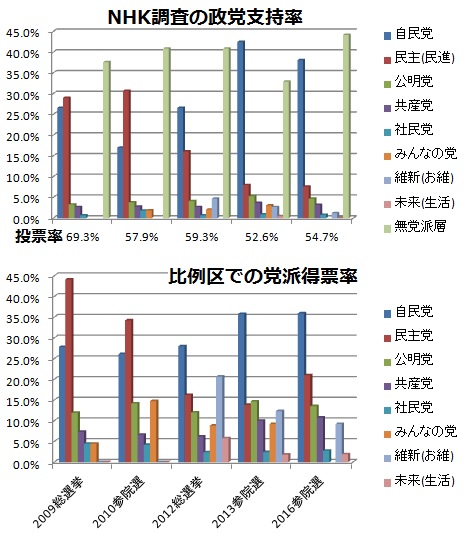 NHK調査の政党支持率と比例区での党派得票率を対比して、2009総選挙から2010参院選、2012総選挙、2013参院選、2016参院選と並べました。政党支持で目につくのは今回、無党派層が44.2%とかつて無い多さになっている点です。改憲の自民から離れる層があり、民進は民主の時代からの低迷を脱せず、維新の分裂もあって行き場がない無党派層が膨張しました。