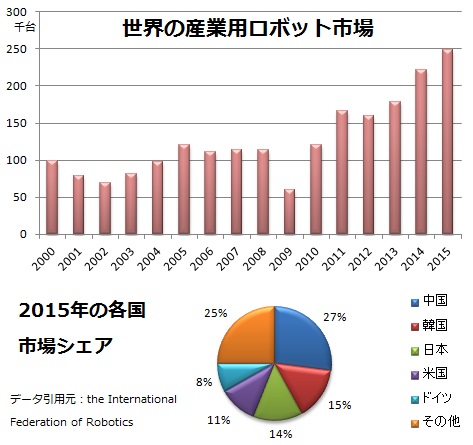 中国は世界最大の産業用ロボット市場になり、国をあげてロボット産業を育成し千社もメーカーが出来ました。独ロボット大手クーカの買収にも手を出す急拡大ぶりが脅威になるか、最近続く報道から実態を探ってみます。2015年に世界の産業用ロボット市場で売られたのは24万8000台、この内、6万7000台が中国に導入されています。中国が世界一の市場になったのは2013年からであり、2018年には15万台と2倍以上になると予測されています。世界産業用ロボット市場の推移と2015年の各国シェアをグラフで見ましょう。