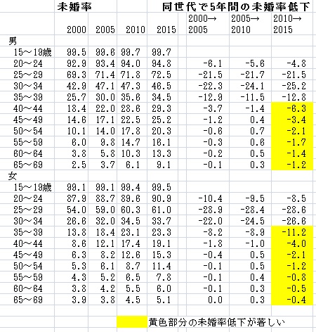 表で黄色の部分が未婚率低下が著しく、注目されます。「2000→2005」と「2005→2010」の動きを見れば男性の40歳以上は「もう結婚を諦めた」と判断できる状況でした。未婚率低下がプラスになっている部分がありますが、調査漏れなどで起きる統計誤差なので無視して下さい。