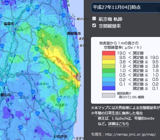 上図は《放射線量等分布マップ拡大サイト》に掲げられている昨年11月時点での地表1メートル空間線量率マップから引用です。年間20ミリシーベルトは3.8マイクロシーベルト/時に相当しますから、黄色以上の地域でまだ大きな広がりがあります。年間5ミリシーベルト相当の放射線管理区域では、福島以外なら法律によって飲食禁止であり、寝泊まりなど論外です。年間5ミリシーベルトはマップでは1マイクロシーベルト/時の濃いグリーン以上で、今なお広範囲であると知れます。放射線障害防止法が決めている公衆の被ばく限度年間1ミリシーベルト以下を満たすのは濃い青とやや濃い青の地域で、かなり原発から離れなければなりません。
