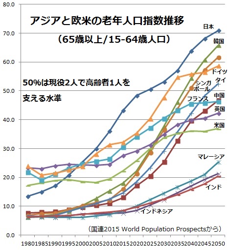 20世紀は欧米より老年人口指数が低かった日本が1995年以降、猛烈なカーブで上昇していきました。このカーブと同じ勢いで2015年から韓国とシンガポールが急上昇します。いや、踊り場がある日本に比べて一直線の上昇ぶりで、2050年には日本の近くに迫ります。タイもそれに近い勢いです。2050年の指数を並べると、日本70.9%、韓国65.8%、シンガポール61.6%、タイ52.5%です。