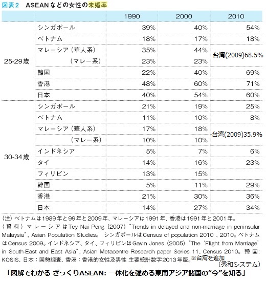 アジア諸国での非婚化がどう進んだか分かる一覧表をネット上で見つけました。各国女性「25-29歳」と「30-34歳」の未婚率を1990年、2000年、2010年で推移が見えます。脚注にあるように様々なデータを参照しなければ出来ない労作です。『図解でわかる ざっくりASEAN: 一体化を強める東南アジア諸国の“今”を知る』(秀和システム刊)から「図表2 ASEANなどの女性の未婚率」を引用です。台湾のデータが欠けていたので、別の資料から2009年分だけ補い、空欄になっていたマレーシアのところに挿入しました。