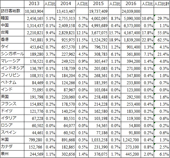 4年間の累計には複数回、来日している人も含まれます。訪日外国人旅行者消費動向調査によると、これまでは初来日客は全体の2割とされていましたが、2016年には4割まで膨らみました。1%が訪日したとして初回は0.4%だけで2回以上は0.6%、重複訪日を省いて実質比率は3分の1の0.2%と推定すると「6掛け」くらいで見れば良いでしょうか。1.6%の英国以上の国は国民の1%以上に訪日経験があると考えられるでしょう。