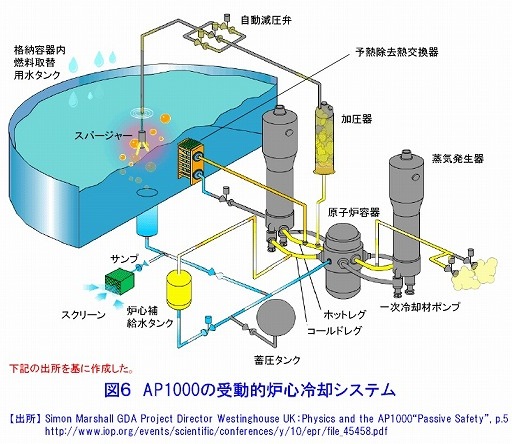 ATOMICAサイトの《AP600及びAP1000 (02-08-03-04)》から引用した「AP1000の受動的炉心冷却システム」の図です。高い位置に燃料取替用水タンクを置いて、電源喪失時や冷却系の故障時でも弁が開いて炉心に注水され崩壊熱除去は運転員が何もしなくても3日間は大丈夫となっています。福島原発事故で海水炉心注入に苦労した事態を思い起こして下さい。安全への取り組みが軽減されて《ポンプ、弁、配管、電線等の減少が著しい。すべてのポンプ類とディーゼル発電機が非安全系となったことも単純化に寄与している》とされ、コスト低減、工期短縮に威力発揮のはずでした。