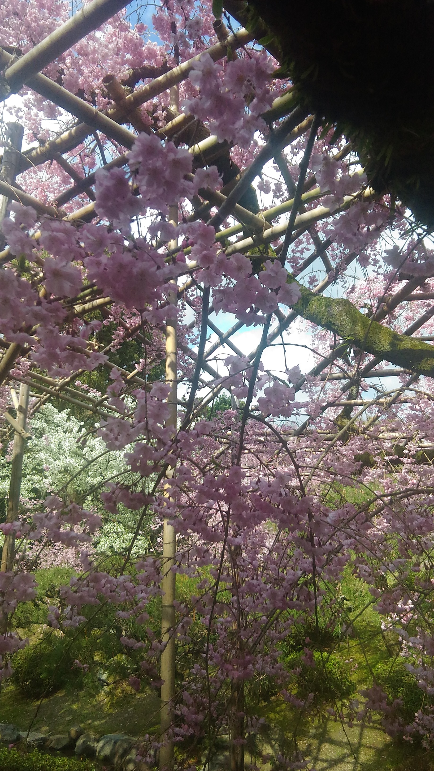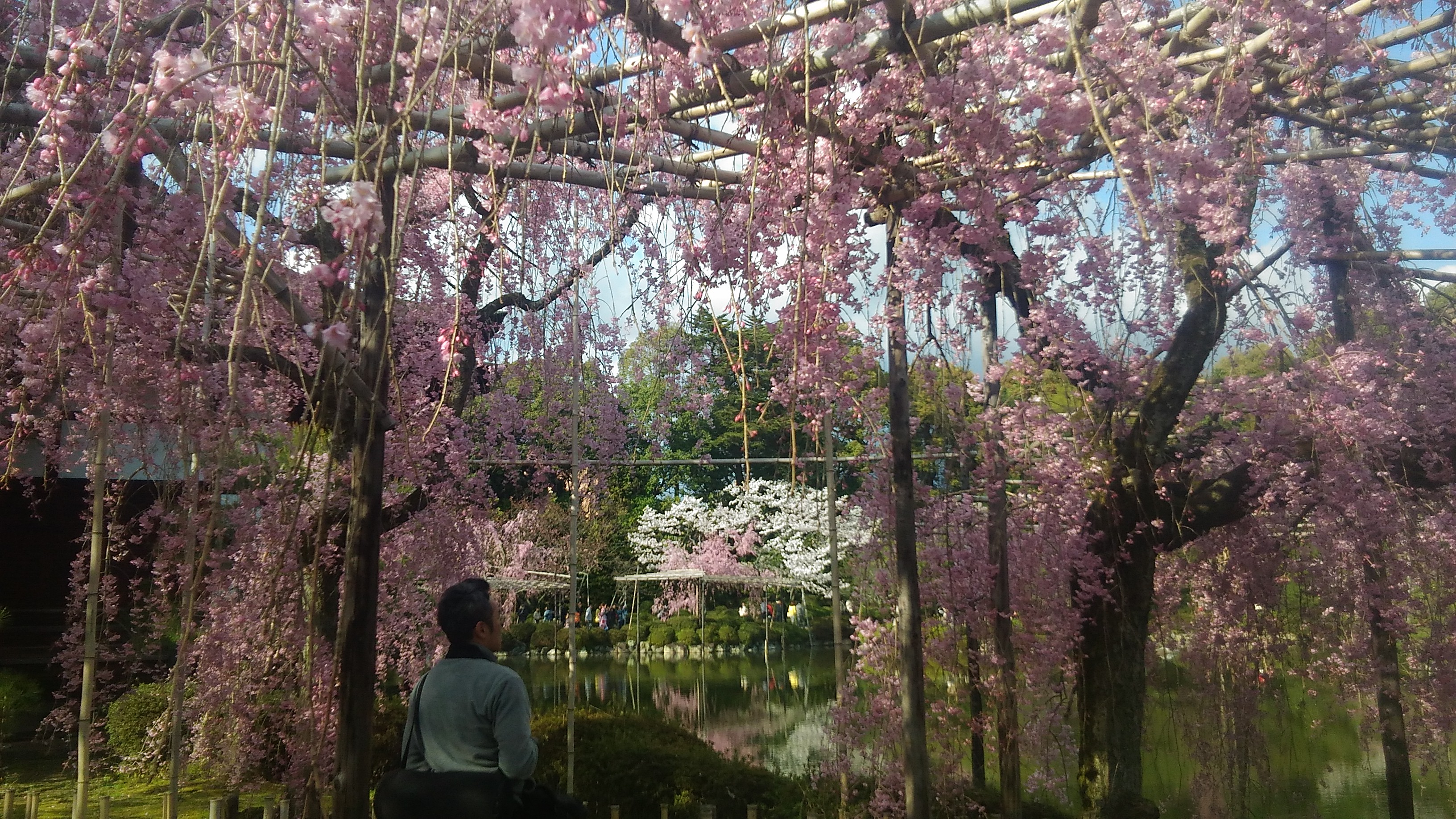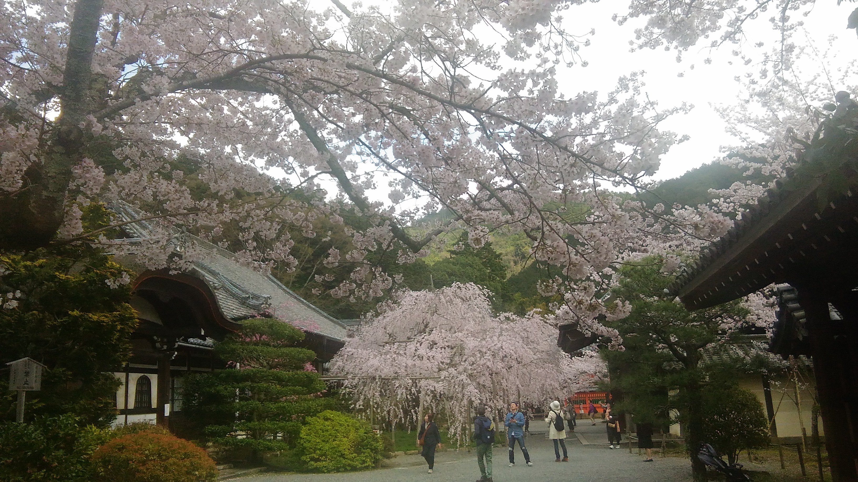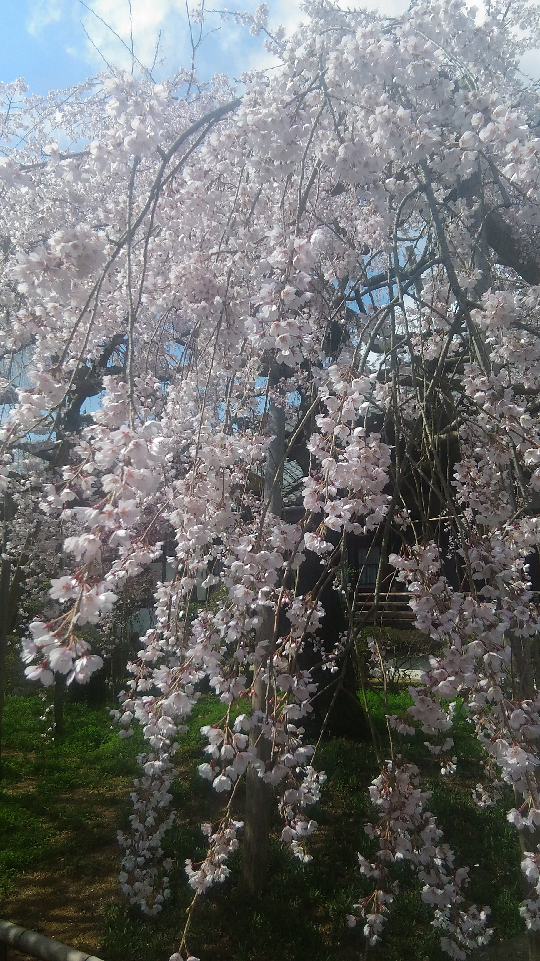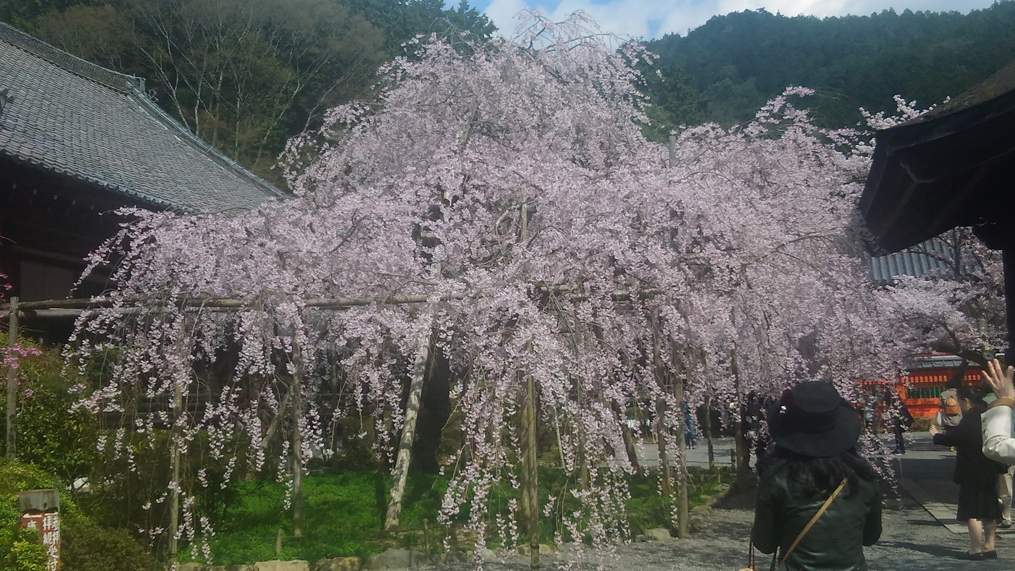 毘沙門堂の枝垂れ桜です。遠景から寄っていきます。ちょうど日が照って来ました。