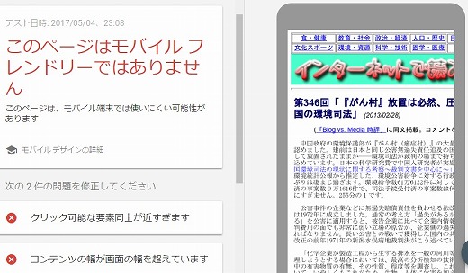 私の「インターネットで読み解く!」からのページを、グーグルのモバイルフレンドリーテストに掛けた例です。もともとパソコンで読んでもらうページですから横幅がスマホ画面の2倍くらいの設定になっています。スマホできちんと読むなら横方向にもスクロールしなければなりませんから「このページはモバイルフレンドリーではありません」と駄目が出されました。