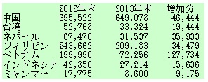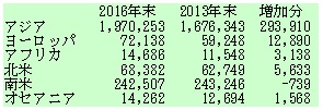 どの地域の増加が多いのか、在留外国人統計で調べます。法務省による在留外国人統計は統計のとり方が住民基本台帳と少し違いますが、似通った数字になる2016年末と2013年末で比較します。
