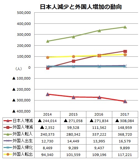 住民基本台帳で外国人の登録者数が分かるようになったのは最近で、上のグラフに示す2014年1月1日からしか利用できません。これに人口動態調査も合わせて、進行中の日本人減少を阻むようになった外国人増加傾向を2017年までまとめました。外国人の国外からの転入が大きく増えているのに、国外転出はさほど増えず、外国人総数は2014年の200万人が2017年には232万人になりました。2014年には外国人もマイナスだったのに2017年には148,959人の増加に転じ、日本人の308,084人減少の48%を補ったことになります。外国人の出生数も2017年に16,579人まで増えています。また年間1万人に近い外国人帰化があり、こちらは日本人としてのカウントに回ります。