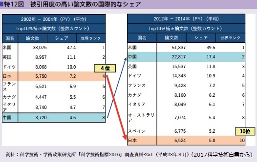 科学技術白書から世界の研究者による引用が多い重要論文のシェア推移の表を引用しました。過去十数年で4位から10位に落ち、こうした国際的な劇的地位低下を受けて日経の《科学分野のノーベル賞ゼロ 科技相に危機感》はこう伝えています。