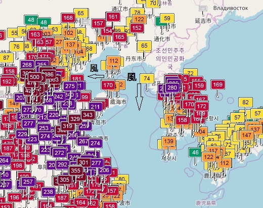 聯合ニュースによると、ソウル市の25区で午後6時に平均PM2.5濃度が116マイクログラム/立方メートルを記録しました。午後8時過ぎの段階で中国から韓国、日本にかけてのAQI指数マップを上に取り出しました。この時の風向きは黄海を北風が吹き、北京に近い渤海湾では東の風でした。中国・河北省などは「500」など重度の汚染状況にあるものの、風向きから韓国に影響するはずがありません。