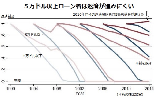 2月16日付けブルッキングス研究所リポート《Most students with large loan balances aren't defaulting. They just aren't reducing their debt》のフルテキスト版にあるグラフ「FIGURE 8」を引用しました。借入額5万ドル(約530万円)の上下2グループの返済ぶりを4%の抽出調査で比較しています。返済開始年が1990、1994年ではどちらも完済ですが、1998年は借入が少ないグループが10年ほどで完済したのに、高額グループは2014年でも4割ほどの金額が未返済です。2010年返済開始の高額グループに至っては返済どころか利子がかさんで5%ほど借金額が増えました。