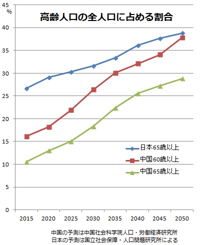中国社会科学院人口・労働経済研究所などの公表データから、中国の60歳以上と65歳以上人口、それに日本の65歳以上人口がそれぞれ全人口に占める割合予測をグラフにしました。65歳以上同士で比較すると、中国は日本から30年遅れで高齢化に突き進んでいます。ところが、中国の60歳以上人口のグラフは急カーブで立ち上がり、日本の65歳以上に対して2015年段階で20年遅れ、2030年には15年遅れ、さらに2050年には追い付いてしまいます。