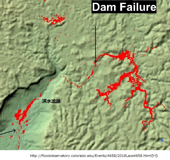 上は決壊の日からツイッターなどに出回っていた写真ですが、どの場所で何時ごろに撮影されたか不詳でした。vop.co.krの《ラオスのダム崩壊、設計・施工に釈然としない疑惑》(韓国語)によると、地域の市民活動家団体である「LaosFAB」が写真をフェイスブックページにあげ住民の避難を促したそうです。これを見ると、すでに越流は起きて堤防は壊れ始めていますが、貯水池の水位は少し下がっています。23日午前3時から緊急放流が始まったそうですから住民避難要請が出た昼頃の写真なのでしょう。決壊は緊急放流から15時間後でした。
